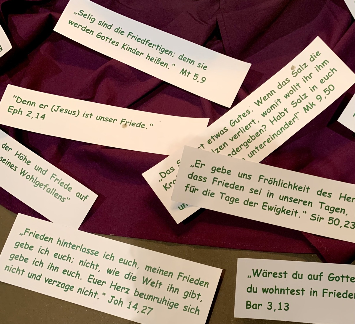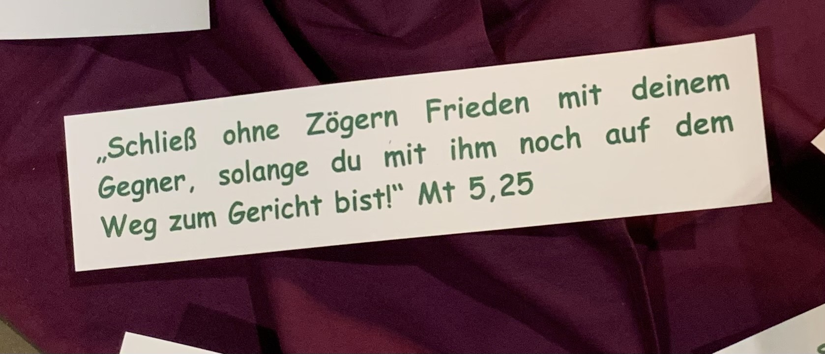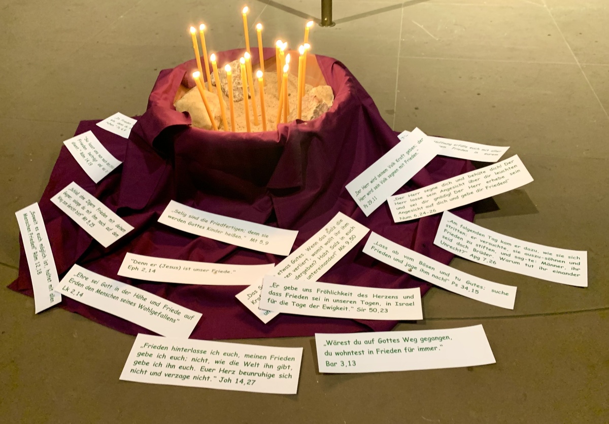 Diesen Fragen wollten wir nachgehen, in eigenen Gedanken, mit der Musik, mit den Gedanken aus Michaels Endes "Unendlicher Geschichte", mit Bibelstellen und im Gespräch mit unseren Nachbarn. Und vielleicht ist es uns etwas gelungen, dass aus meinem Frieden, aus deinem Frieden durch unsere kleinen Beiträge immer mehr unserer Frieden entstehen kann. Unser Frieden! Mit Ausrufezeichen.