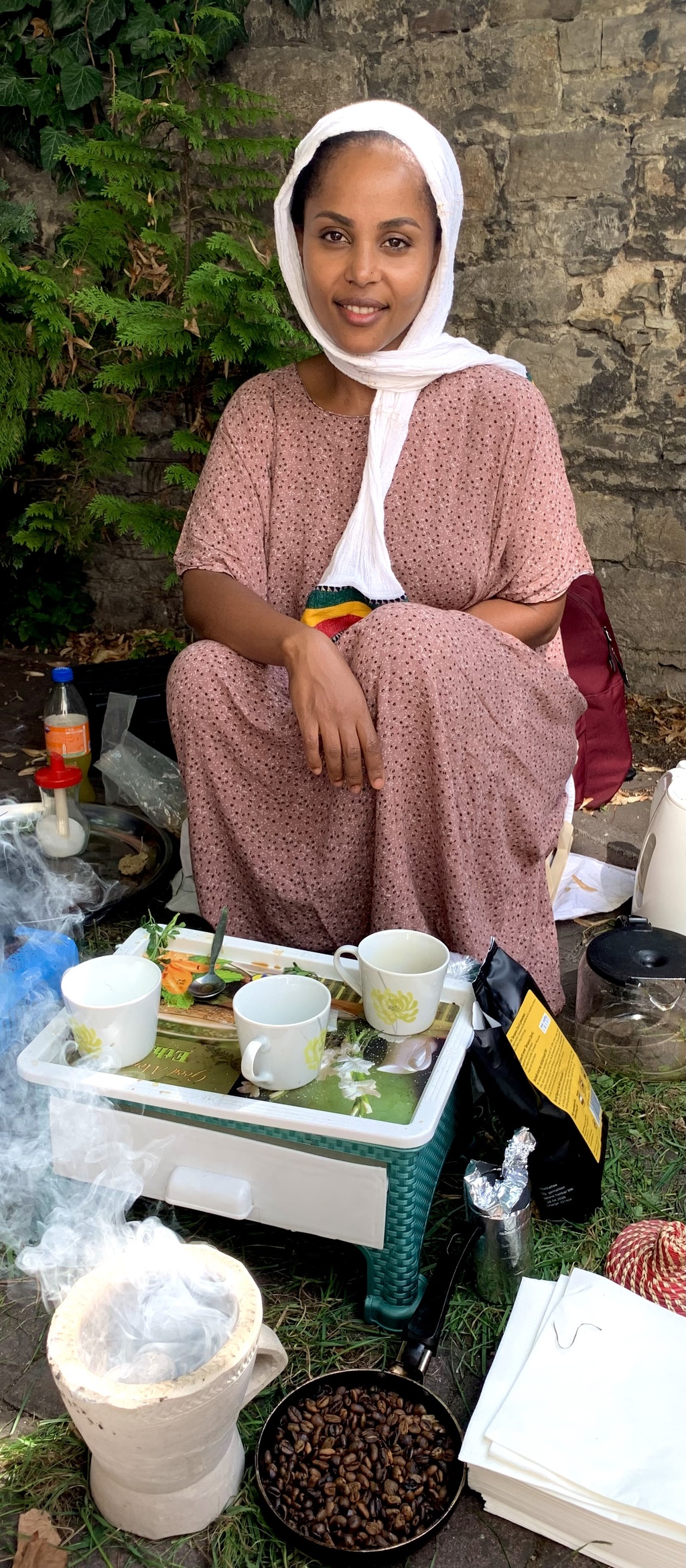 Der Garten des alten Pfarrhauses hatte seine Pforten geöffnet und es konnte bei schönstem Wetter gefeiert werden. Gemeinsam mit der polnischen sowie der äthiopischen Gemeinde wurde erst ein Festgottesdienst gefeiert, Pfarrer Dr. Petro Müller und Pfarrer Walenty Cugier gestalteten diesen zweisprachig und zum Abschluss sang der Kinderchor der äthiopischen Gemeinde. Anschließend war für das leibliche Wohl bestens gesorgt: Es wurde gegrillt, die Äthiopier hatten Lammfleisch mit Fladenbrot, Gemüse und Linsen vorbereitet, dank der polnischen Gemeinde zog ein verlockender Duft von frischen Waffeln durch den Garten. Für den Kaffee waren viele leckere Kuchen und Torten von allen Gemeinden bereitet. Etwas Besonderes war auch in diesem Jahr wieder die äthiopische Kaffeezeremonie. Die Kaffebohnen wurden frisch geröstet, Grundlage für einen hervorragenden Kaffee, gilt Äthiopien doch als Geburtsland der Kaffeebohne.