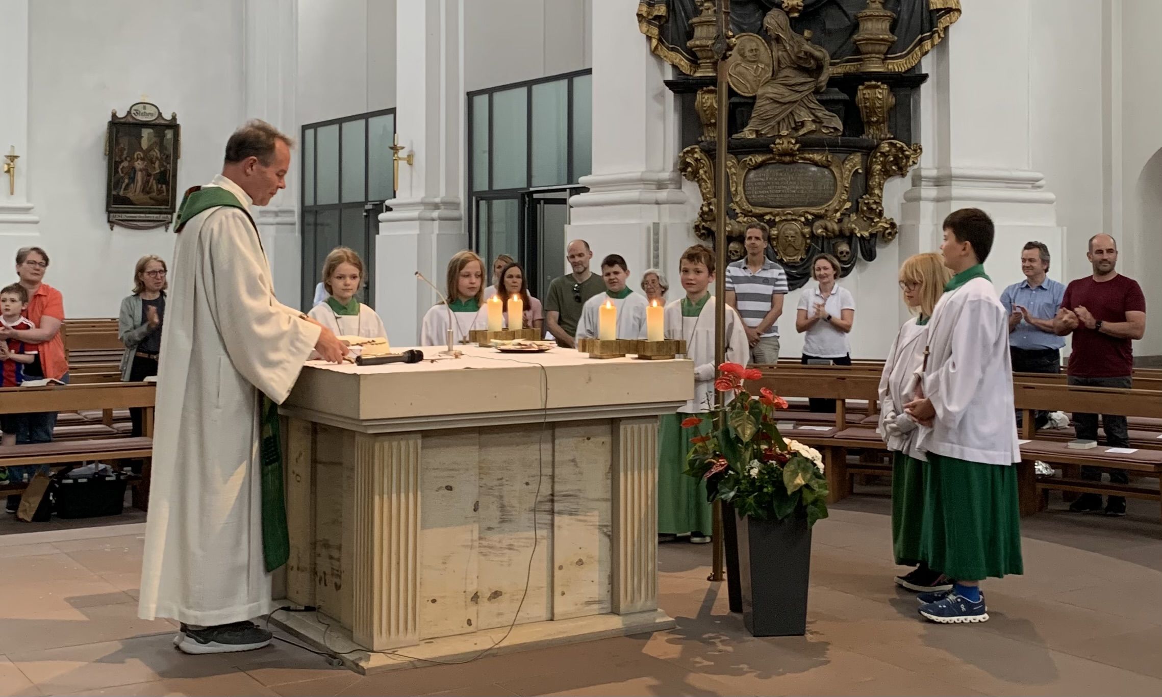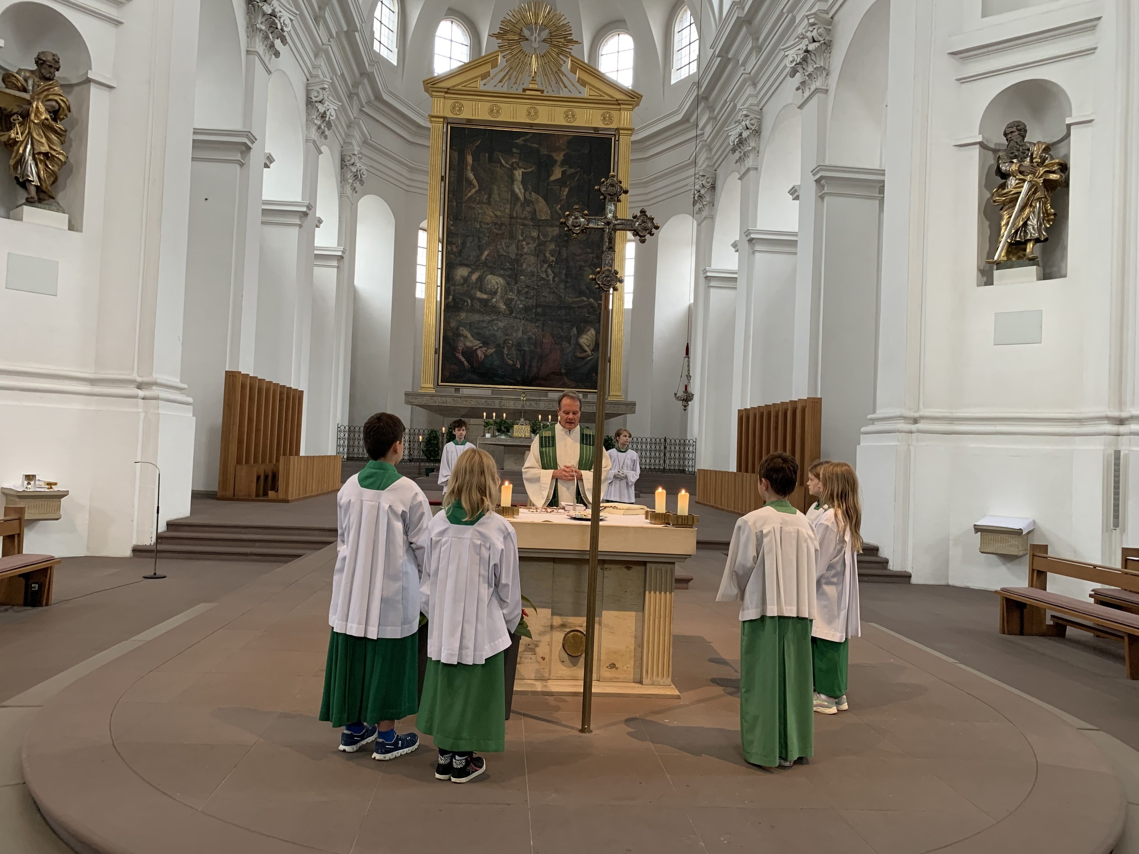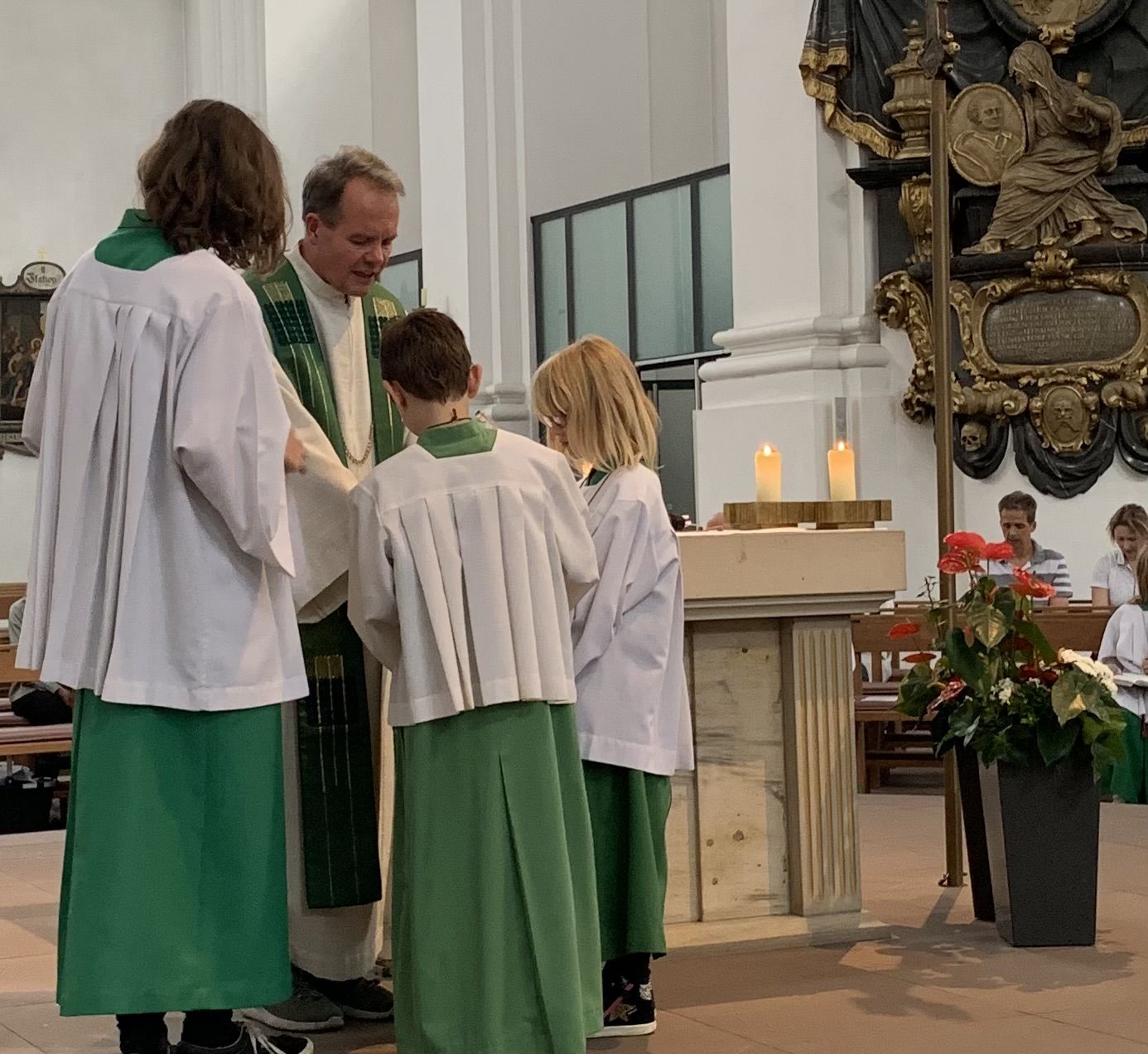 Acht Kinder aus dem diesjährigen Kommunionjahrgang haben sich dazu entschieden, die Ministrantengruppe in Stift Haug zu unterstützen. Am Freitagabend wurden sie im Rahmen der Messe feierlich willkommen geheißen und in ihr neues Amt eingeführt.
