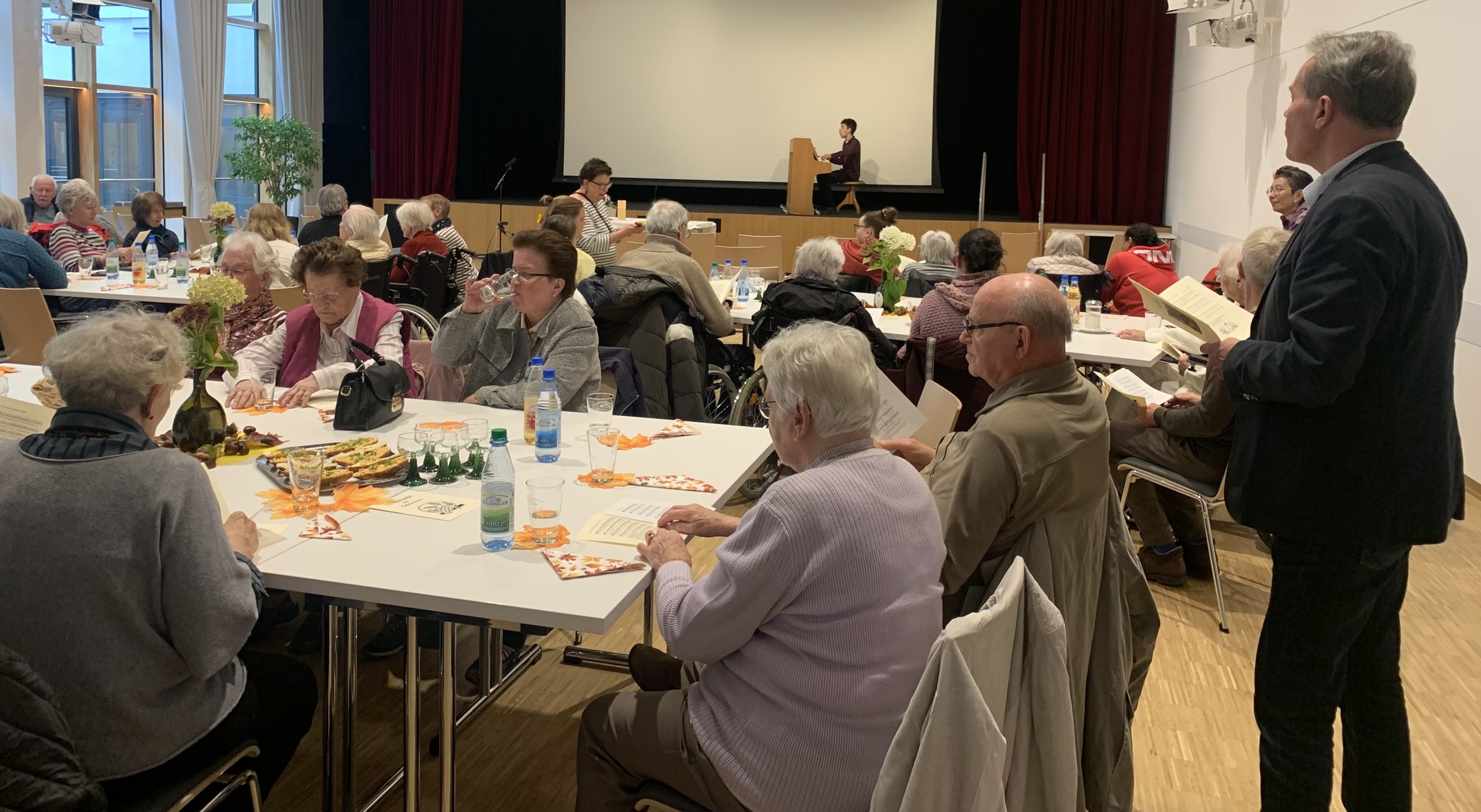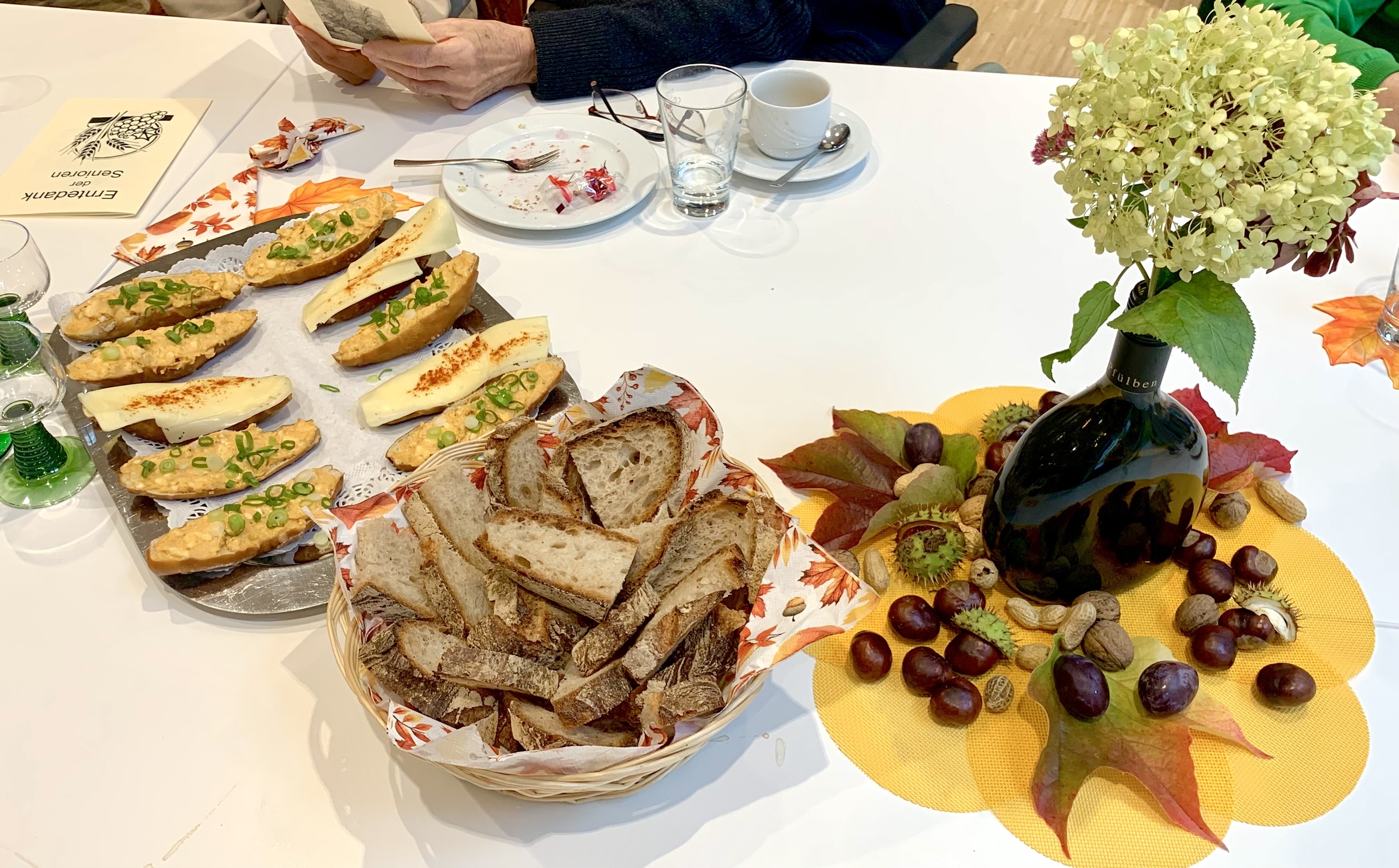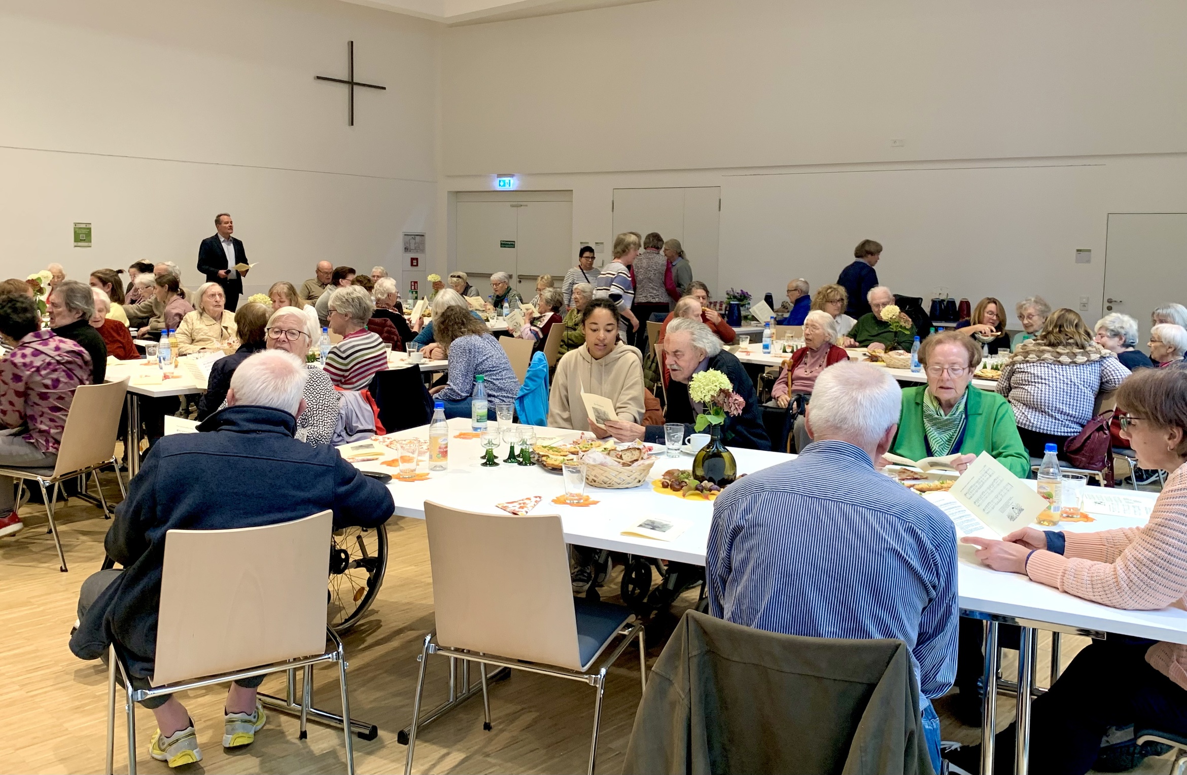 es wurde gesungen, ein Film nahm alle mit in die 60er Jahre zur Weinlese in Randersacker, es gab Gedichte, ein Teilnehmer hatte das "Gebet eines Senioren" mitgebracht und es wurde "geratscht". Dabei leitete wie immer Pfarrer Müller moderierend durch den Nachmittag. Schließlich gab es noch guten Bremer und liebevoll vom Helferkreis vorbereitete Laugenstangen mit verschiedenen Käsevarianten.