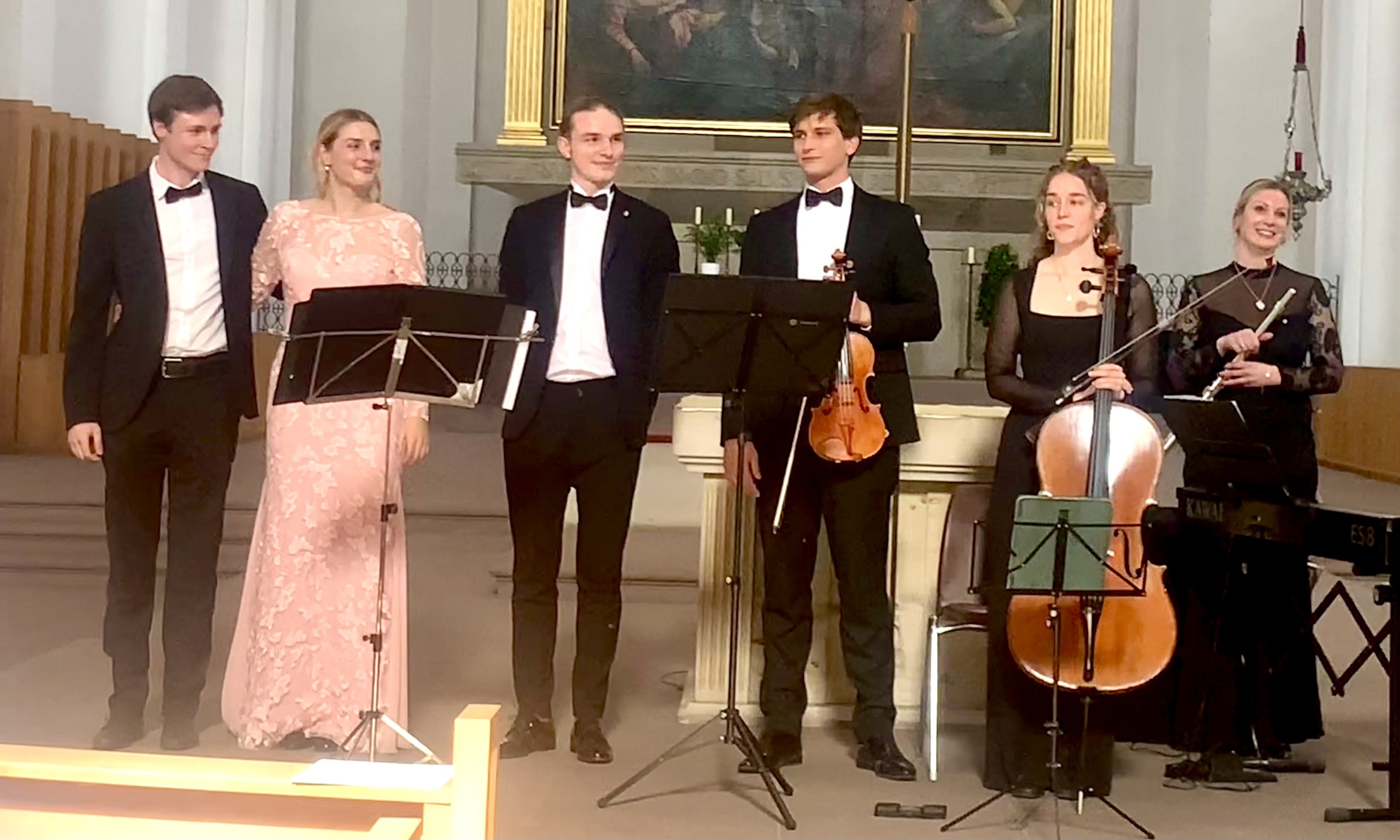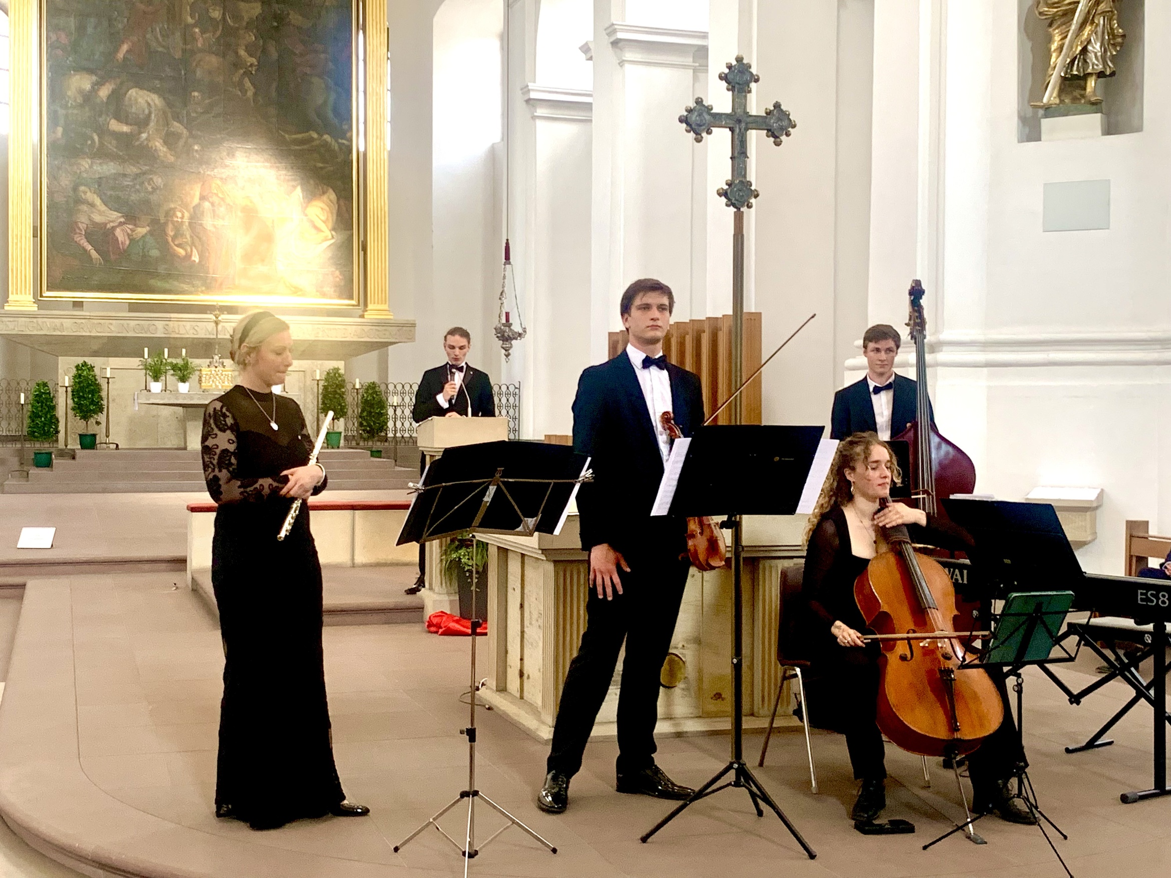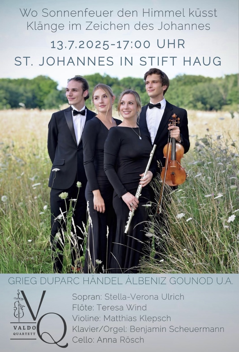 Das ValdoQuartett präsentierte ein facettenreiches Programm, das von barocker Finesse bis zu spanischem Feuer reichte und das Publikum mitnahm auf eine musikalische Reise durch Epochen und Emotionen. Nach einem imposanten Auftakt an der Orgel verbanden die Worte von Pfarrer Petro Müller das Thema des Abends auf geistlicher und musikalischer Ebene. Das Valdo-Quartett mit Benjamin Scheuermann (Klavierr und Orgel), Teresa Wind (Querflöte), Matthias Klepsch (Geige) und Stella-Verona Ulrich (Gesang) wurden an diesem Abend unterstützt durch die Gastmusiker Anna Rösch (Cello) und Sebastian Scheuermann (Kontrabass). So durfte das Publikum einmal mehr die technischer Brillanz, die klanglicher Klarheit und beeindruckende Ausdruckskraft dieser Musiker erleben. Durch ganz persönliche Hinfürhrungen zu den Stücken ist es dem Valdo-Quartett nicht nur über die Musik gelungen, eine Verbindung zu den Zuhörern herzustellen.