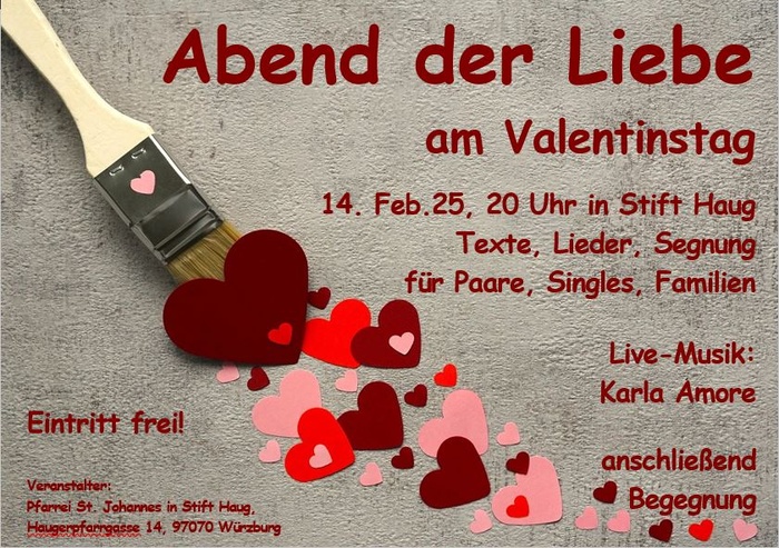 Am 14. Februar ist Valentinstag! Das ist nicht nur die Erinnerung der Blumengeschäfte. Auch wir laden an diesem Abend um 20.00 Uhr zu unserem nun schon traditionellen Abend der Liebe in der Friedenskapelle von Stift Haug ein - mit Texten. Live-Musik, Segnung und anschließendem Beisammensein.